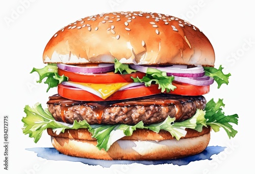 burger, watercolor, drawing, white background, food, fast food, painting, hamburger, cheeseburger, isolated, no people, hand-drawn, artistic, bun, lettuce, tomatoes, cheese, onion, sesame seeds, delicious, appetising, epicure, snack, meal, art, creative, colourful, tasty, detail, design, edible, cookery, modern, vibrant, illustration, culinary, unique, sandwich, meat, fast food, fast, fat, sesame, beef