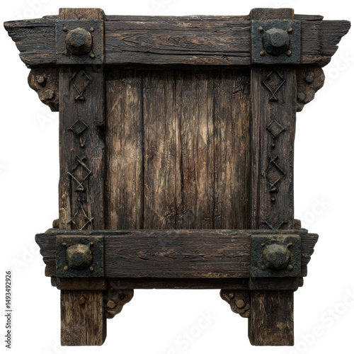 Weathered rustic wooden signboard with ornate metal accents and aged planks, perfect for signage, decorations, or vintage themed designs