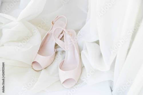 wedding shoes on white background. pastel shoes with heels. celebration . wedding card