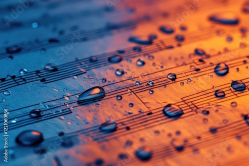 music, sheet, water, drop, note, vibrant, colours, abstract, background, close, up, art, design, texture, macro, liquid, rain, wet, musical, score, melody, harmony, rythm, orange, blue, droplet, splash, illumination, concept, image, photo, graphic, illustration, pattern, light, dark, aesthetic, beauty, elegance