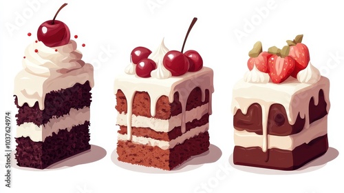 Whimsical Black Forest Cake Collection: Fun Game Style Icons in Low Poly and Minimalist Design on White Background