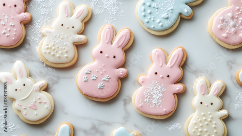 Whimsical bunny shaped cookies in pastel colors on marble surface