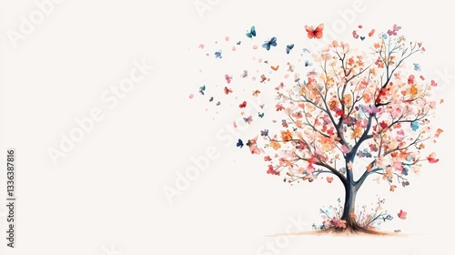 Whimsical Hand-Drawn Watercolor Tree with Colorful Butterflies and Floral Borders