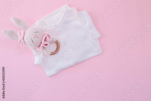 White bodysuit on a pink background. Waiting for the girl. Pregnancy. Clothes for newborns