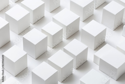 White boxes scattered on bright surface create geometric pattern. Soft lighting highlights edges, enhancing minimalist aesthetic. Birds-eye perspective. Neural network AI generated