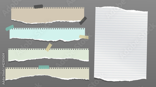 White, colorful torn note, notebook paper pieces are on dark grey background for text, advertising or design. Vector illustration