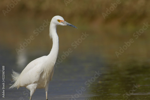 white egret (egretta thula) in a blurred wet farming location in search of food