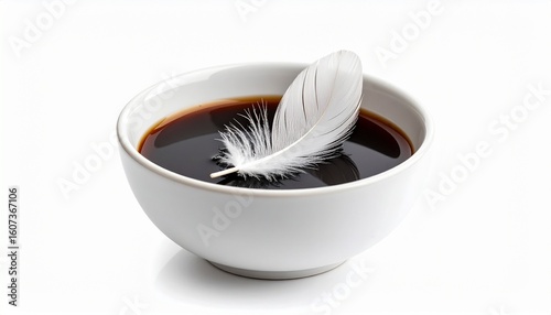 feather, soy sauce, bowl, white, dark, contrast, minimal, fragility, purity, floating, liquid, surface, still, porcelain, symbolic, serene, balance, tension, texture, contemplative, poetic, elegant, unexpected, food, art, composition