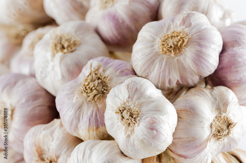 White garlic head heap. top view.