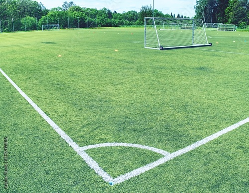 White line corner of the soccer field, pattern of green grass for football sport,