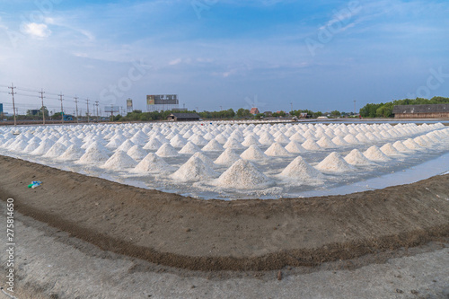 White salt piles in the vast salt fields of the sea
