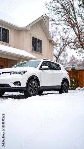 suv, white, snow, winter, driveway, house, parked, car, vehicle, cold, residential, landscape, exterior, scene, grey, home, wheel, tire, roof, tree