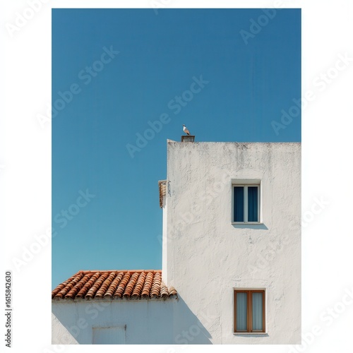 building, house, architecture, exterior, white, sun, sky, blue, terracotta, roof, bird, window, daylight, photo, still, simple, minimalist, vacation, travel, daytime, residential, photographic, view, contemporary, minimalism, calm, serene, photo, image, copy space, isolated