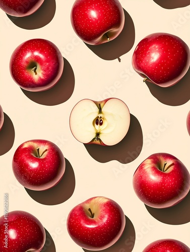 whole red apples spread evenly and neatly with one cut center white background realistic illustration poster pattern