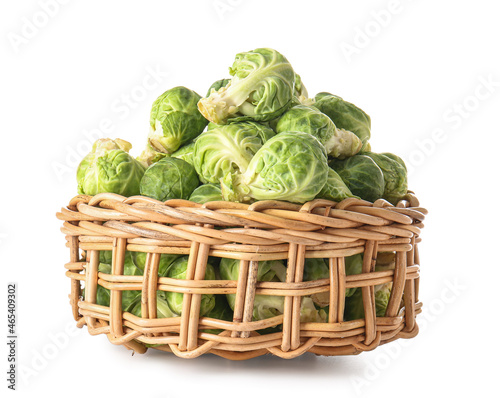 Wicker basket with fresh Brussels cabbage on white background
