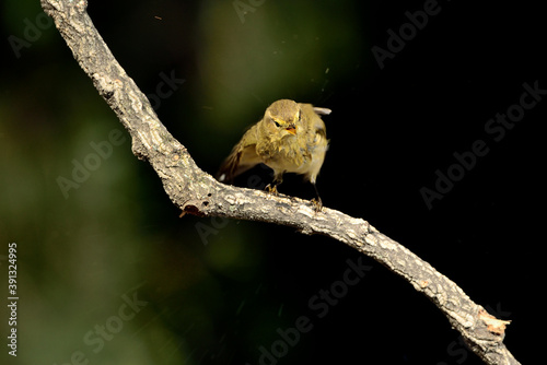 Willow warbler en la rama con fondo verde oscuro (Phylloscopus trochilus) Ojén Málaga España