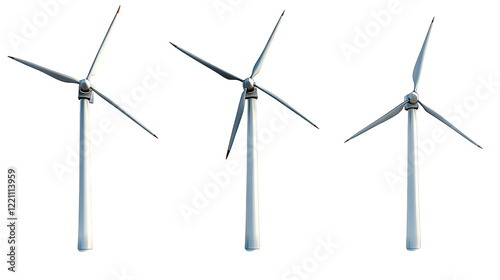 Wind Turbine Trio: Three towering wind turbines stand tall, blades gracefully turning against a clear, sunny backdrop, symbolizing sustainable energy and environmental stewardship.