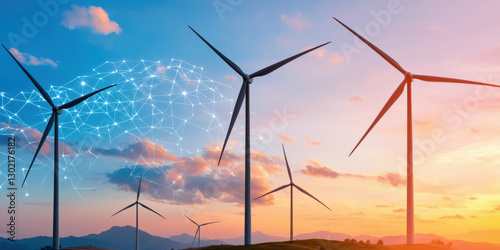 Wind turbines stand against a vibrant sunset, symbolizing renewable energy and innovation in a sustainable landscape.
