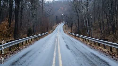 Winding Rainy Road Surrounded by Leafless Trees in Autumn's Embrace Creating a Mysterious Pathway : Generative AI
