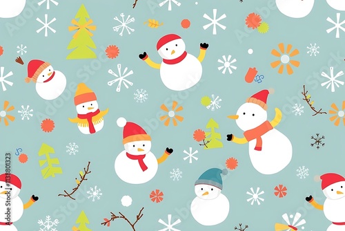 Winter Wonderland Snowmen Pattern: Charming seamless pattern featuring adorable snowmen in colorful hats and scarves, snowflakes, and festive elements on a light teal background.