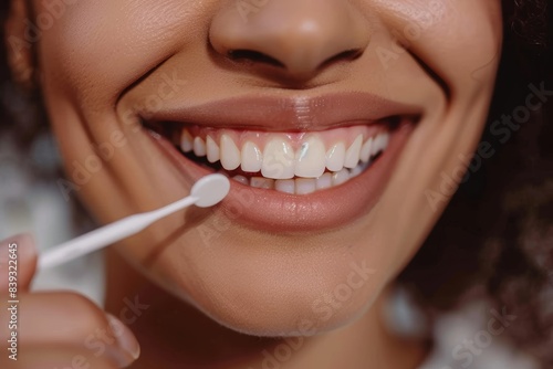 whitening, teeth, smile, woman, closeup, oral, hygiene, beauty, dental, care, bright, healthy, process, strip, application, cosmetic, clean, mouth, health, freshness, personal, grooming, treatment, aesthetic