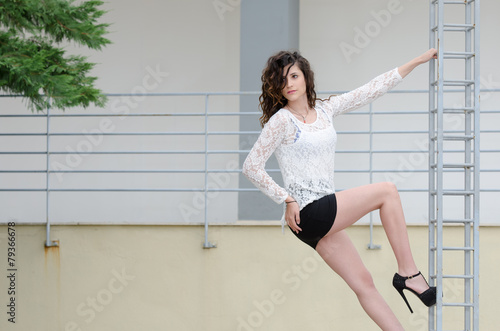 iron, railing, white, lace, female, woman, metal, beautiful, adult, pipe, brunette, style, portrait, lady, lifestyle, curly, touching, fabric, leg, long, heel, short, climbing, holding, supported, steel, frame, leaning, against, suspended, face, pretty, young, looking, look, through, hand, hair, model, attractive, closeup, hide, cheerful, lonely, curious, calm, resting, natural