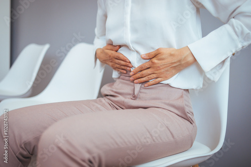 female, discomfort, sitting, waiting room, health, pain, white blouse, office, chair, abdominal pain, sick, waiting, disease, medicals, symptom, clothing, indoor, casual attire, health care, problem, disease, condition, care, treatment, patient, clinic, uncomfortable, pain relief, seated, ache, troubled, stress, tension, therapy, medicine, consultation, anxiety, appointment, exam
