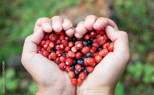 Woman hands holding handful ripe fresh forest berries in heart shape. Blueberry and wild strawberry in human palm.