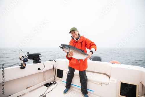 angler, boat, fisherman, fishing, fishing pole, happy, leisure, ocean, outdoors, raincoat, recreation, rod, ocean life, seafood, sport, water, woman