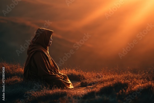 woman, meditation, meditating, monastic, field, grass, sunrise, sunset, robe, brown, nature, outdoors, early, morning, light, gold, peaceful, zen, mindfulness, quiet, calm, serenity, calmness, spiritual, spirituality, religion, religious, buddhist, buddhism, yoga, practice, relaxing, relaxation, lotus, position, sitting, closed, eye, asian, hours, hood, thinking, contemplating, contemplation, person, female, adult, bald, shaved