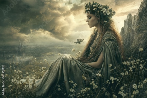 woman, nature, landscape, flower, crown, dusk, contemplation, serenity, scenery, aethereal, beauty, silhouette, wilderness, fantasy, cloud, grass, mountain, quiet, calmness, art, outdoors, goddess, character, enchanting, dreamlike, peaceful, mythology, harmony, aura, calm, portrait, light, shadow, foliage, green, inspiration, peace, elegance, dream, scenic, atmospheric, wildlife, view, culture, tradition, scene, imagination, earth, escape
