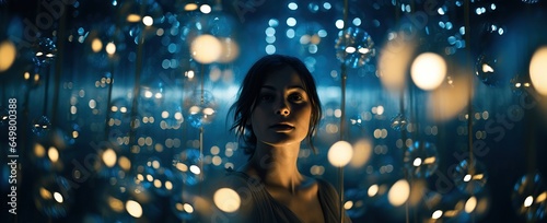 Woman in the Middle of some Golden and Cyan Particles over a Blurred Background. Shiny and Defocused Particles.