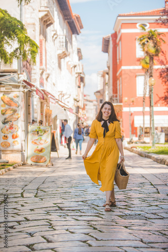 woman in yellow dress with bit straw hat walking by old tourist city in croatia