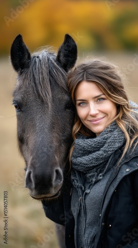 woman, horse, autumn, countryside, nature, black horse, smile, peaceful, warm, landscape, friendship, rural, calmness, joy, beauty, connection, scenic, equine, afternoon, candid, natural light, fall, pet, relaxing, togetherness, portrait, closeup, outdoors, harmony, agriculture, lovely, leisure, brown hair, foulard, harvest, softness, autumn color, affectionate, gentle, companionship