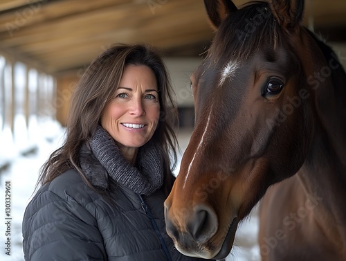 woman, horse, barn, winter, snow, smile, portrait, equine, stable, outdoors, happy, beautiful, brown, animal, mammal, friendship, connection, nature, cold, season, equestrian, riding, farm, country, lifestyle, serene, peaceful, majestic, strong, confident, healthy, care, love, bond, human relationships