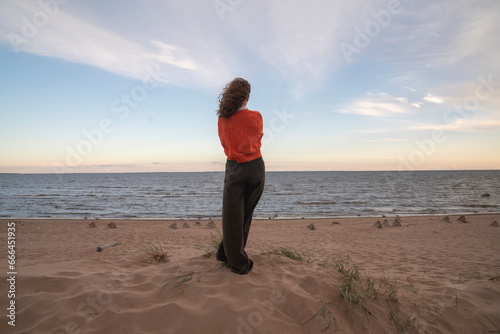 woman, standing, sand, sea, cloudy, sky, 1, people, travel, adult, journey, outdoors, sunset, atmosphere, backview, pullover, nature, horizon, water, looking, coast, landscape, leg, crossed, ankle, female, holiday maker, tour tourism, redheaded, orange, sweater, young, beach, caucasian, vacation, lifestyle, cloud, colours