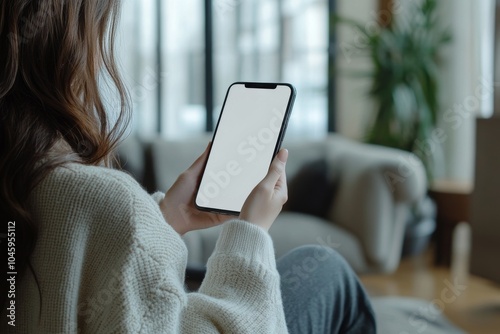 woman, female, girl, hand, hand, holding, smartphone, phone, mobile, device, screen, blank, white, display, technology, digital, cyberspace, social, media, communication, network, wireless, home, living room, sofa, couch, comfortable, cosy, relax, relaxing, modern, interior, apartment, house, lifestyle, indoor, casual attire, sweater, jean, sitting, back, rear, view, app, application, website