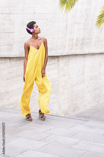 Woman wearing yellow jumpsuit listening music with headphones