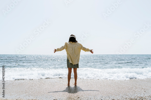 woman, arm, outstretched, beach, sunny, day, music, earphones, copy space, 1, people, travel, adult, journey, female, outdoors, sunlight, spain, backview, standing, sky, casual attire, leisure, motion, holiday, vacation, earbud, wave, water, horizon, mid, listening, korean, ethnicity, asian, lifestyle, enjoyment, weekend, sea, coast