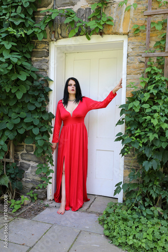 attractive, woman, lady, mediaeval, castle, courtyard, gothic, doorway, red, dress, costume, black hair, beautiful, barefoot beach, gate, danger, skittish, fairy tale, fantasy, building, evil, concept, halloween, vampire, beauty, fairy tale, enchantress, door, goth, brunette, ivy, sorcerer, gown, escaping, red dress, stone building