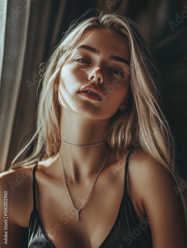 woman, long, hair, blond, black, top, fashion, beauty, lifestyle, portrait, female, adult, human, person, clothing, dress, style, trendy, casual attire, everyday, modern, contemporary