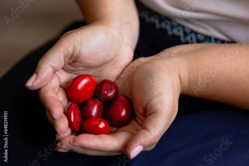 Woman's hands holding red painted stones on the palms of her hands. Concept of relaxation and spiritual practice. Selective approach. Natural light