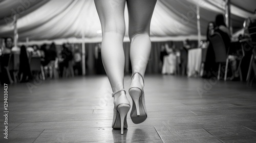 Woman's legs in high heels walking away from the camera, blurred background of an event or party under a tent, monochrome image