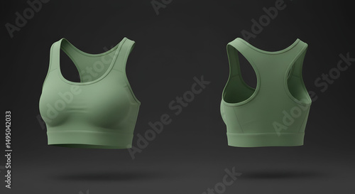 Women's olive green sports bra, studio shot, showcasing front and back views. Athletic apparel for active women, professional use in fitness and sports marketing.