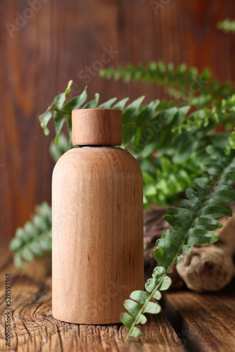 Wooden bottle of cosmetic product and green leaves on table