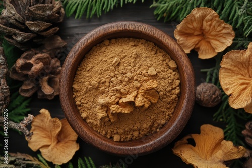 Wooden bowl filled with chanterelle powder, pine cones, leaves around it. Perfect for culinary articles, or showcasing mushroom products.