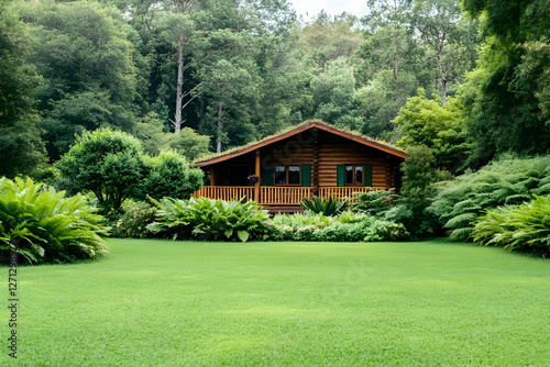 Wooden cabin nestled in lush green forest garden