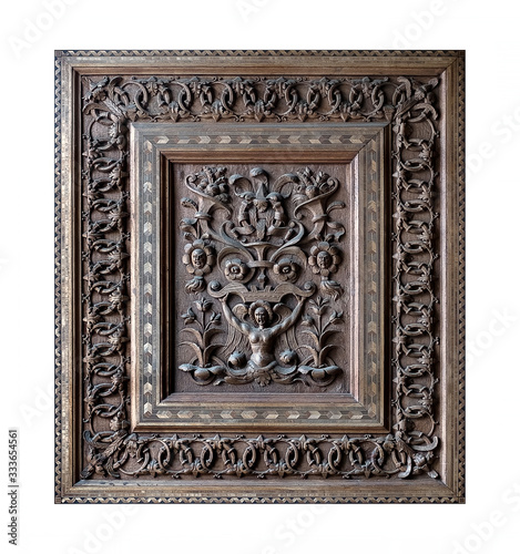 Wooden decorative architectural panel with floral ornament isolated on a white background