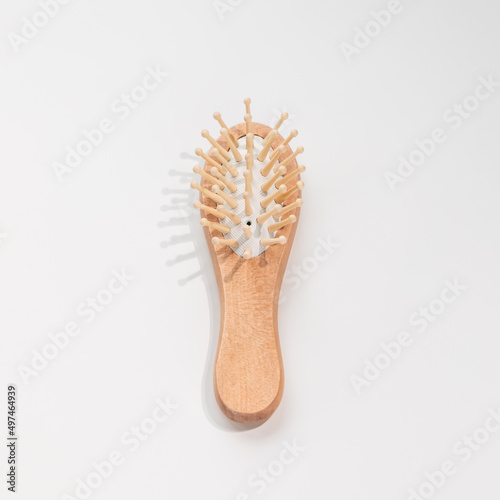 Wooden mini bamboo hair brush for travel, beard or kids on white background. Small pocket brush. Top view, copy space