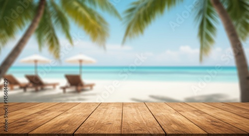 Wooden table overlooking a tropical beach with palm trees, umbrellas and lounge chairs in the distance